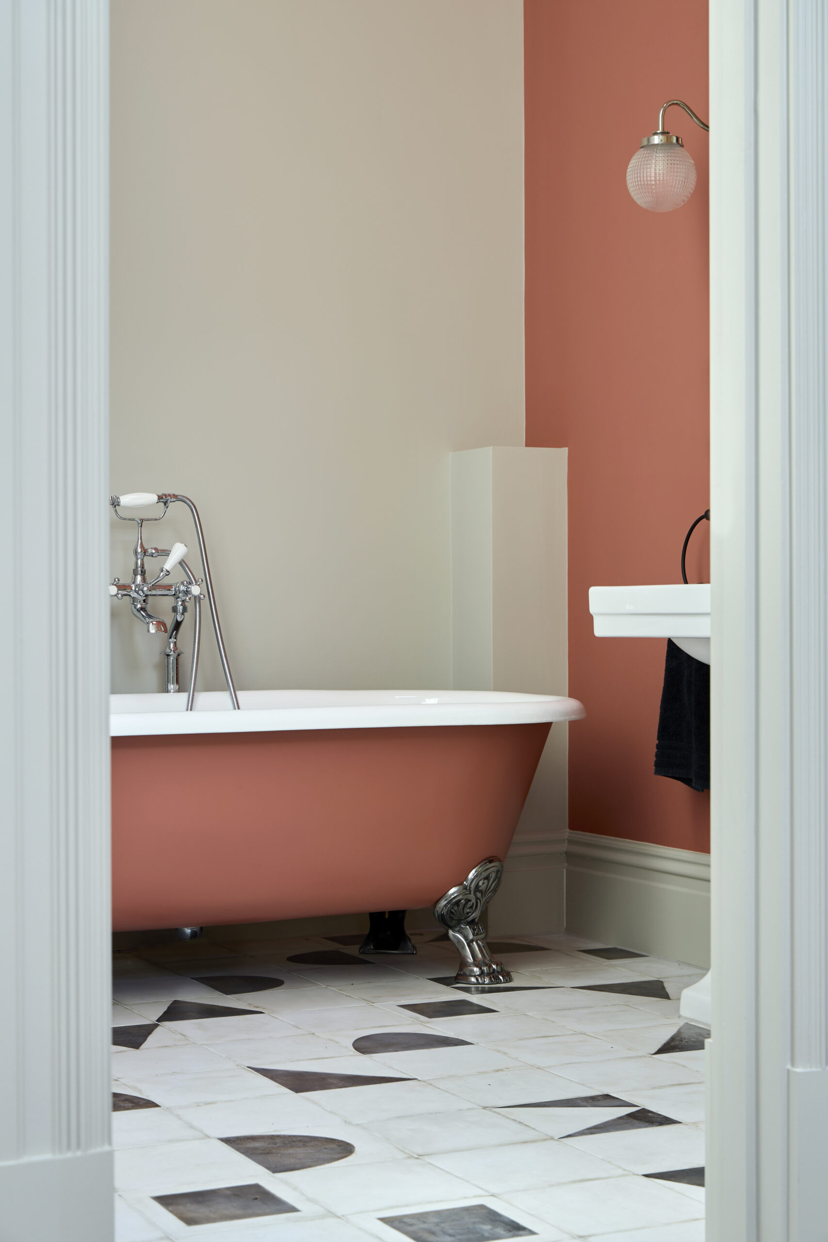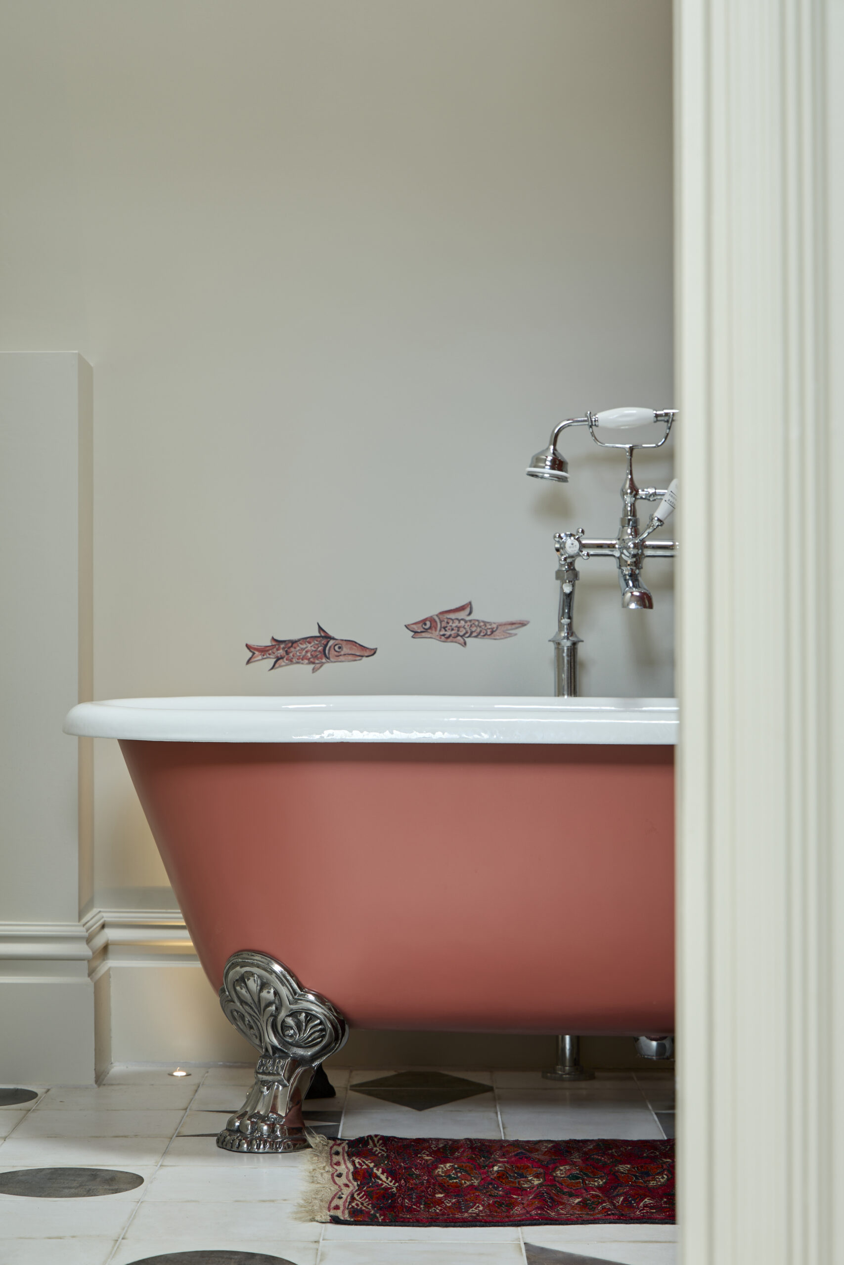 For their guest ensuite, Bella and Mark selected Catchpole & Rye’s Le Piaf Cast Iron Bath, finished in a soft coral paint colour that adds warmth and charm to the space. Above it, two playful fish decals echo the decor of the adjacent room, a subtle nod to Bella’s creative flair and her attention to detail.