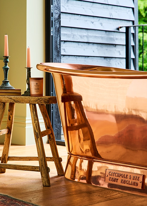 In Bella and Mark’s master bedroom, the centrepiece is The Copper Bateau – rather than being tucked away, it is positioned boldly in the bedroom itself, in front of a full-height wall of glazing that opens onto their balcony. The bath becomes part of the architecture, framed by natural light and views of the outdoors, it transforms the space into a sanctuary. “It is magical, it holds the warmth, and when the sun hits it, it lights up. It’s the most beautiful, alive piece in the house.”
