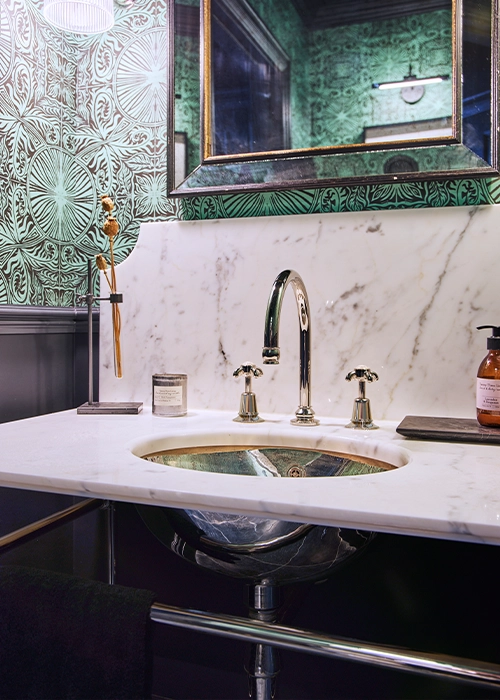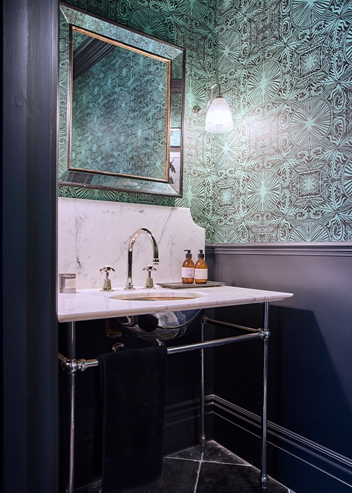 When guests open the door to the downstairs cloakroom, they’re immediately greeted by The Pyrford Single Washstand with Arabescato marble, a piece chosen for its sculptural elegance and quiet grandeur. Bella describes its impact simply: “It fills the space with presence and elegance.” The washstand is paired with Party Room Wallpaper by Anna Hayman Designs, a rich green with soft black undertones and geometric motifs that add depth and drama. The result is a cloakroom that feels bold, artistic, and unforgettable.